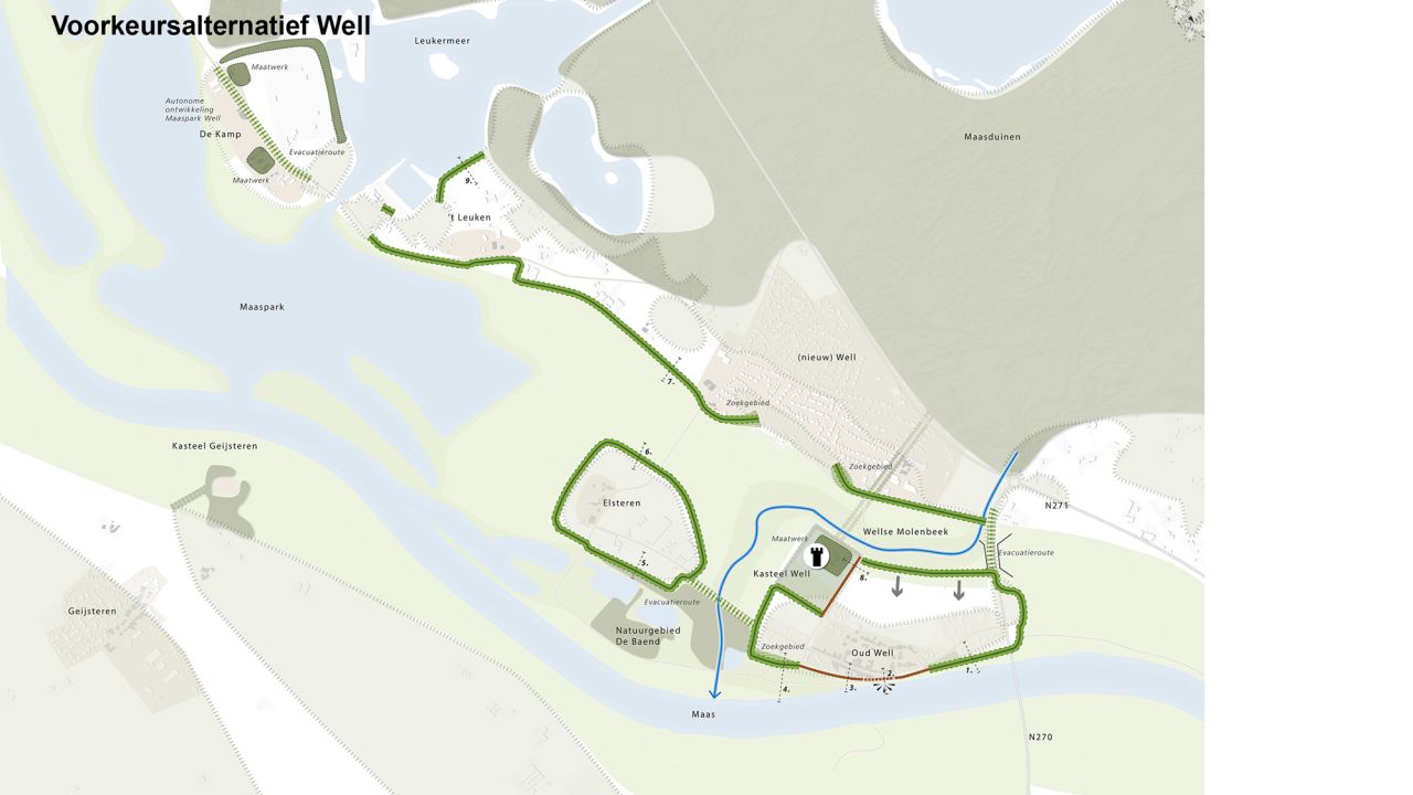 Een voorbeeld hiervan is Well waar een, na 1995 aangelegde, dijk het dorp en achterliggende landschap beschermd. Het idee is hier om ruimte te geven aan een groene rivier door de dijk te terug te leggen waardoor er waterstandverlaging gerealiseerd kan worden. De kernen van Oud Well en Elsteren, die in het winterbed liggen, worden met een zo compact mogelijke kering conform wettelijke norm beschermd.