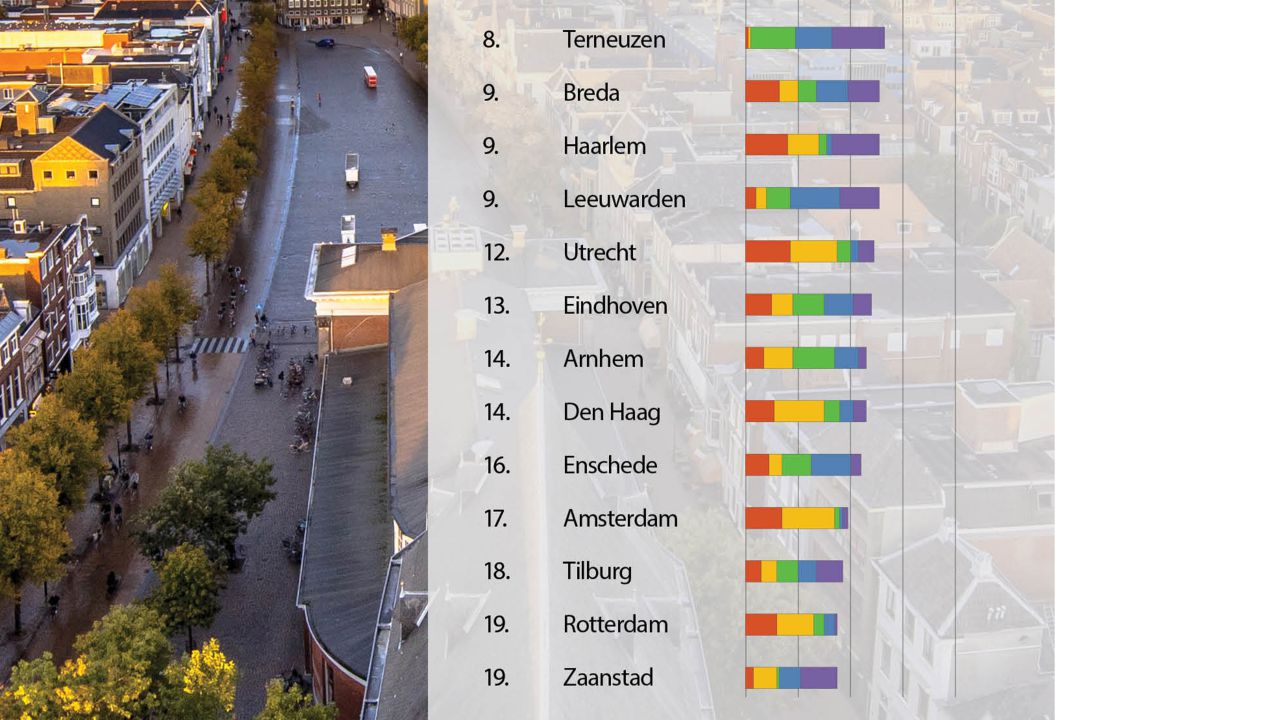 According to this study, Groningen is the healthiest city in the Netherlands. Nijmegen is in second place, with Maastricht coming in third. We evaluated the twenty cities (the largest municipality in each province, along with the eight largest municipalities in the Netherlands) on the basis of five components: mobility, outdoor space, climate, built environment and community. Our researchers made use of data from the National Institute for Public Health and the Environment (RIVM), the Municipal Health Services (GGDs) and Statistics Netherlands.