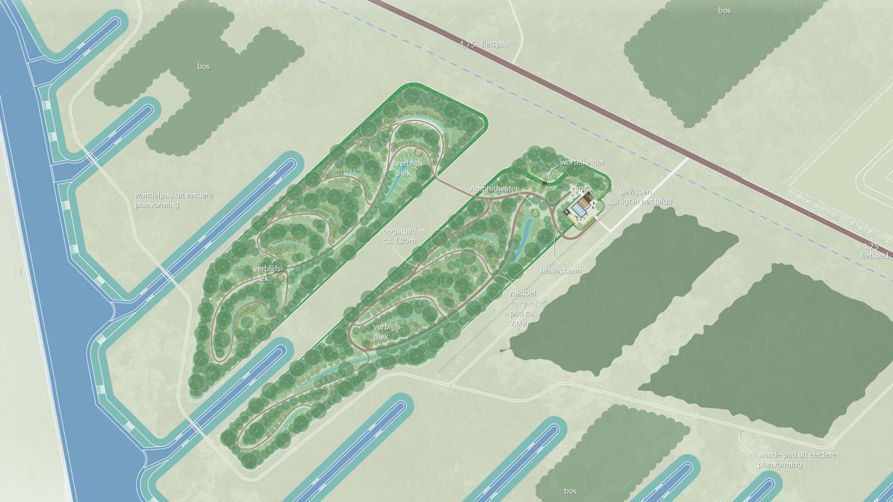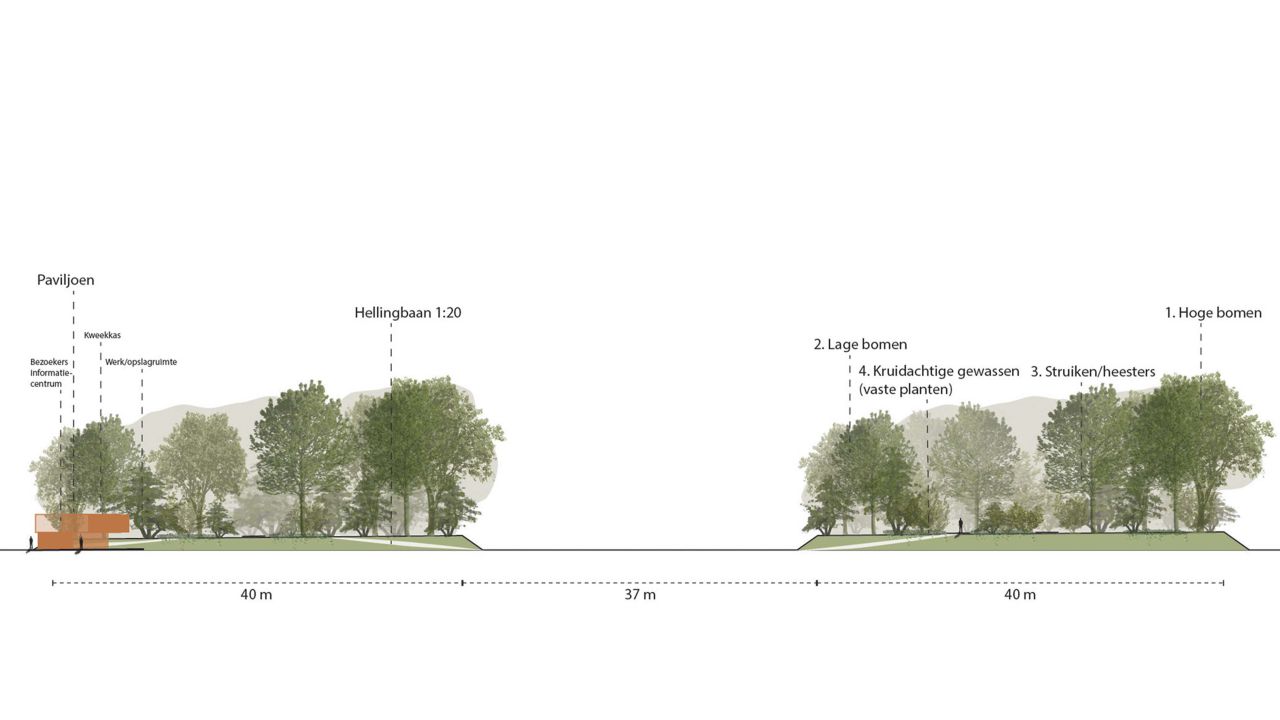 Deze aanpak leverde een multifunctioneel ontwerp op, zo komen er rolstoeltoegankelijke paden en worden er bushcraft plekken ingericht waar kinderen kunnen leren en spelen. Uiteraard is er voldoende ruimte behouden om een grote variatie historische fruitbomen, vruchtdragende struiken en allerlei andere eetbare planten kwijt te kunnen. Naast het ontwerp voor het voedselbos is er geholpen bij het ontwerpen van een paviljoen die als hub voor alle activiteiten moet gaan dienen. Onze architecten kwamen onder andere met de oplossing om het paviljoen volledig self-sustaining op te zetten.