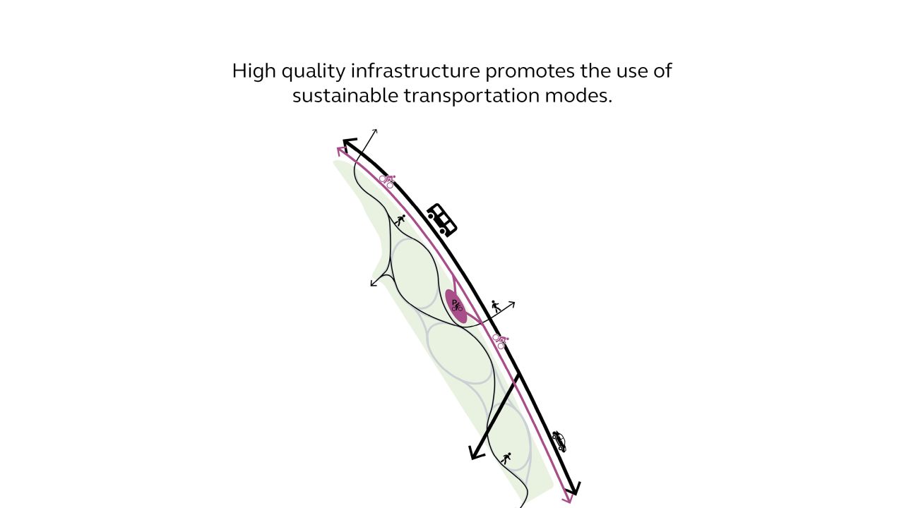 Duurzame mobiliteit staat voorop. De D50 wordt teruggebracht van een 4-baans naar een 2-baans weg en er wordt een kwalitatief fietspad aan toegevoegd. Ook krijgt het park een halfverdiepte fietsenstalling.