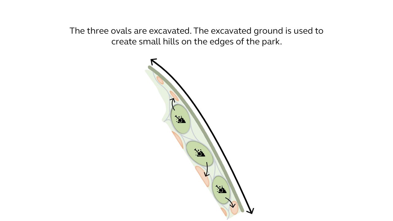 Het ontwerp van het park bestaat uit drie ovalen die elkaar opvolgen in de lengte van het park. Iedere ovaal kent zijn eigen identiteit en programma. Ovaal 1, 'La Place', wordt gekenmerkt door elementen uit een traditioneel Frans dorpsplein, een ontmoetingsplek met verschillende bankjes, petanque banen en een fontein. Ovaal 2, 'Jeux et Sports', nodigt uit tot beweging voor jong en oud, met verschillende fitnesstoestellen, een speeltuin en een voetbalveldje. Ovaal 3, 'La Scène', heeft een kleine kiosk voor straatoptredens en een paviljoen waar men wat drinken kan halen. De drie ovalen liggen verdiept, zodat er goed zicht op is. De grond die wordt weggehaald uit de ovalen wordt weer aangebracht als kleine heuvels aan de randen van het park, om een groener karakter te creëren en omliggende infrastructuur aan het zicht te onttrekken. Verschillende typen bomen, met verschillende bloeiperiodes, zorgen voor een dynamisch beeld per ovaal gedurende het jaar.