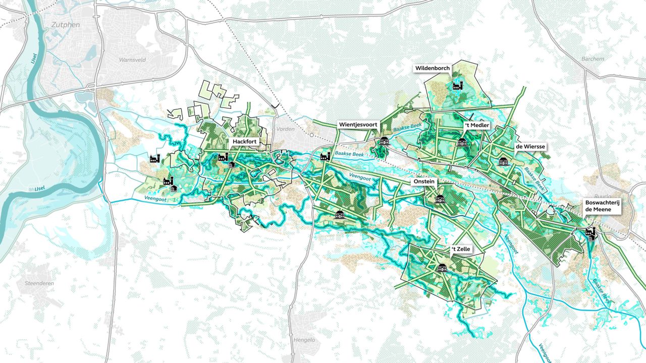Het water uit de Baakse Beek gaat in de toekomst de bestaande laagten in het landschap opzoeken. Zo ontstaat de nieuwe Vordense Beek. Haar collega Sjors de Greeff vult aan “de geïsoleerde zandkoppen in combinatie met het stelsel van samenkomende stroomdalen (gevoed met kwel) maken dit gebied uniek. Er liggen grote kansen voor een grote diversiteit aan natuurontwikkeling. Om deze kansen te benutten werken we samen met het waterschap en de provincie aan een inrichtingsplan voor natuur- en gebiedsontwikkeling. Door de karakteristieke contrasten tussen hoogten en laagten kunnen er natte stroomdalen ontwikkeld worden waar grote potenties voor kwelnatuur liggen. De ontwikkeling van deze natuur kan in samenhang met de transitie naar natuurinclusie landbouw plaatsvinden. Waarbij de historische kern van het landgoed (als cultuureiland) behouden blijft in deze natuurlijke omgeving.”