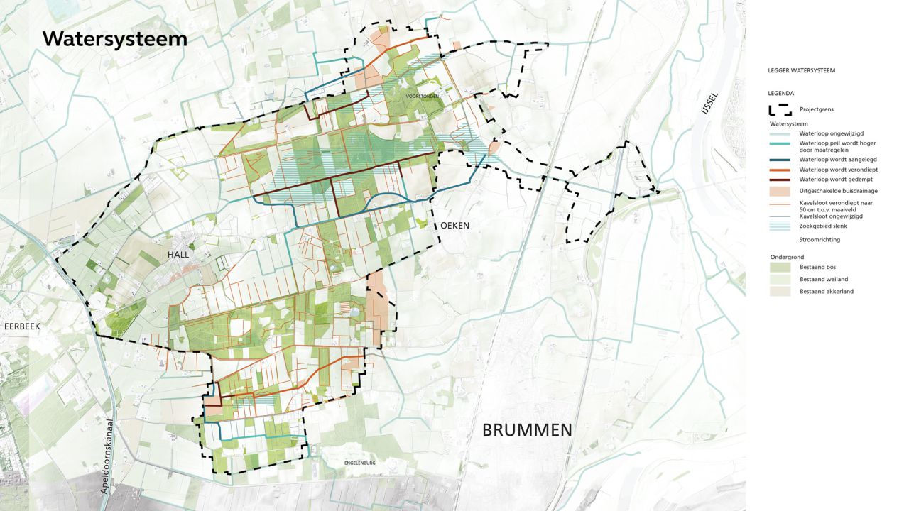 Onze mensen kozen voor een aanpak waarbij eerst schetssessies met het waterschap Vallei & Veluwe, de gemeente Brummen en de Provincie Gelderland werden gehouden. Tijdens deze sessies zijn alle mogelijke hydrologische scenario’s op tafel gelegd. Vervolgens zijn de inwoners, agrariërs en bedrijven van het plangebied erbij betrokken en zijn samen maatregelen bedacht die het gebied ‘klimaatbestendig’ maken. Wij vertaalden dit alles vervolgens in één integraal schetsontwerp die past bij dit gebied. We kozen daarbij voor één belangrijke aanpassing in het watersysteem: minimale afvoer van water in het voorjaar en de zomer. Dit bereiken we door beken in natuurgebied ondieper te maken en te laten slingeren of te dempen. Hierbij wordt gekeken naar de natuurlijke ondergrond van het gebied en we zoeken bestaande laagtes op in het landschap. Daarnaast wordt een deel van de kavelsloten ondieper gemaakt of gedempt. Zo zorgen we ervoor dat het water in de natuurgebieden kan infiltreren.