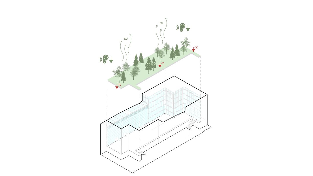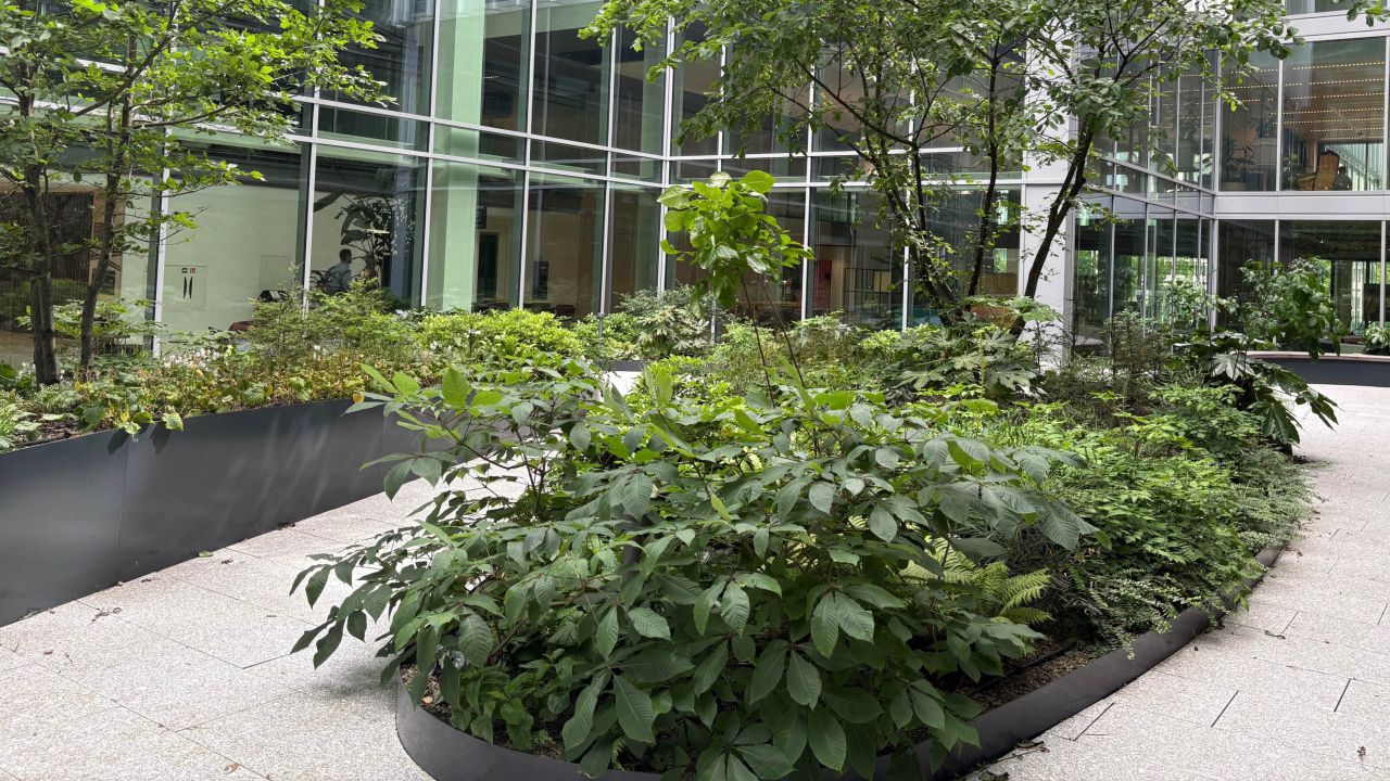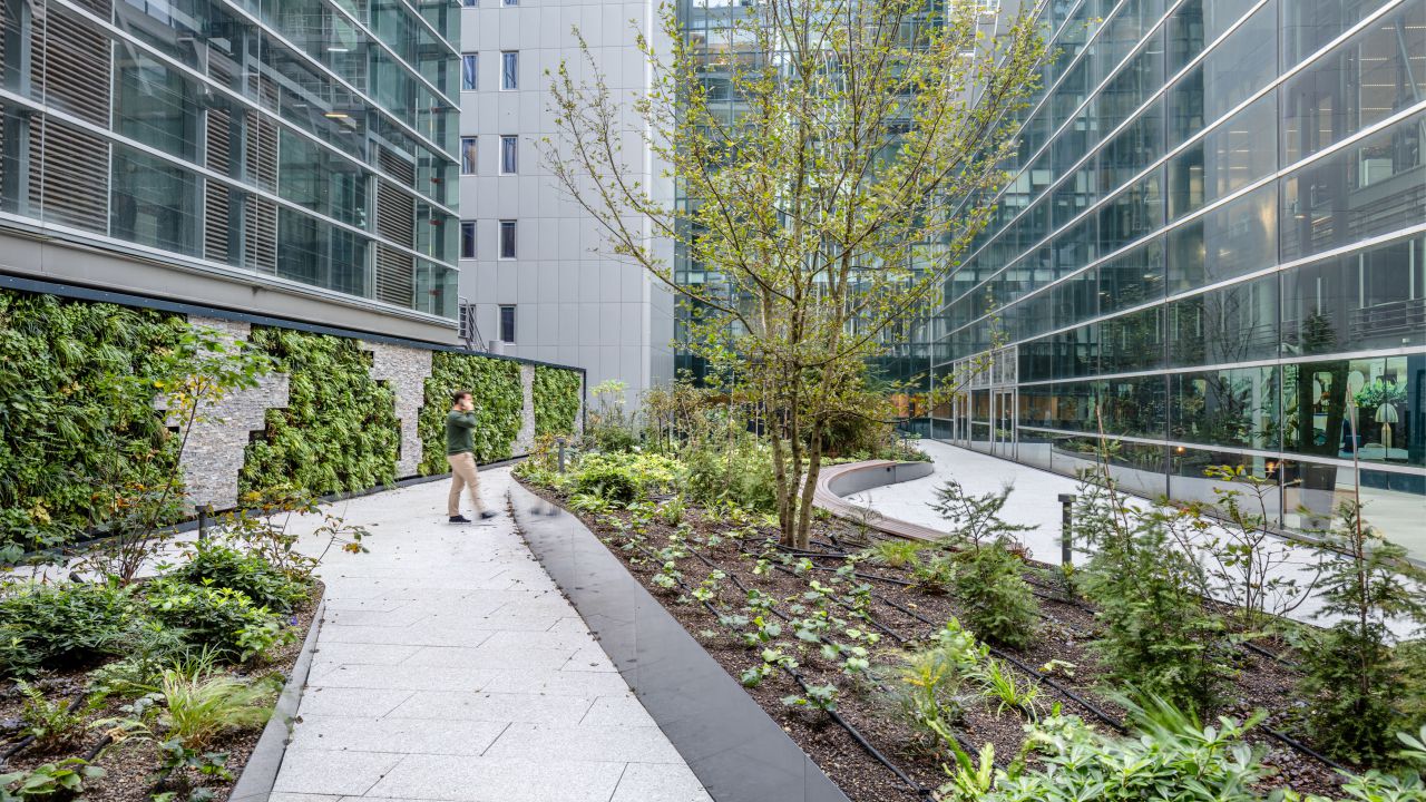 De ligging en opbouw van de patio kenden een aantal uitdagingen waar Arcadis Landschapsarchitectuur en Stedenbouw een oplossing voor heeft geboden. De patio ligt op verdieping 2 en is een daktuin. Het plaatsen van bomen diende te gebeuren bovenop een strakke rij kolommen van de onderliggende parkeergarage. Door te kiezen voor een variatie aan soorten en deze zo organisch mogelijk te positioneren, slaagden we erin een natuurlijk beeld te creëren.