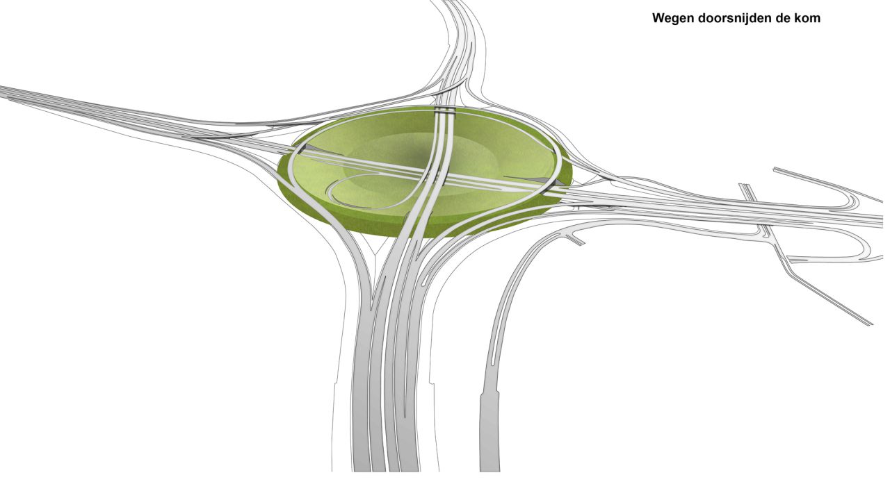 The junction will be given a new configuration, with the landscape playing a central role. Instead of the cloverleaf design, there will be long, curved link roads arranged around a central ‘bowl’. The bowl itself is an open space, surrounded by a high rim with a circle of trees. In addition to improved flow, a unique landscape is created, forming a landmark for road users. Where the junction and its planting first formed an ‘island’ in the ‘sea’ of emptiness formed by the polder, it is now an open space in the highly urbanized area around Amersfoort.