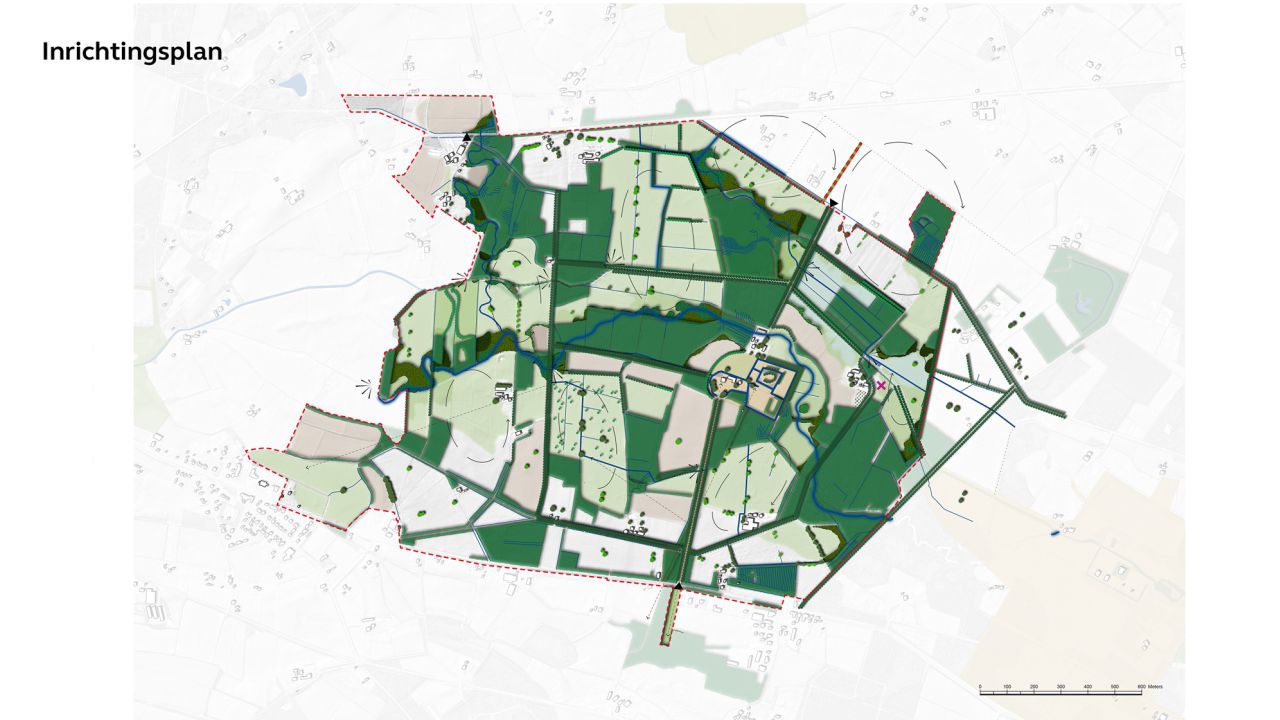 Het water uit de Baakse Beek gaat in de toekomst de bestaande laagten in het landschap opzoeken. Zo ontstaat de nieuwe Vordense Beek. Haar collega Sjors de Greeff vult aan “de geïsoleerde zandkoppen in combinatie met het stelsel van samenkomende stroomdalen (gevoed met kwel) maken dit gebied uniek. Er liggen grote kansen voor een grote diversiteit aan natuurontwikkeling. Om deze kansen te benutten werken we samen met het waterschap en de provincie aan een inrichtingsplan voor natuur- en gebiedsontwikkeling. Door de karakteristieke contrasten tussen hoogten en laagten kunnen er natte stroomdalen ontwikkeld worden waar grote potenties voor kwelnatuur liggen. De ontwikkeling van deze natuur kan in samenhang met de transitie naar natuurinclusie landbouw plaatsvinden. Waarbij de historische kern van het landgoed (als cultuureiland) behouden blijft in deze natuurlijke omgeving.”
