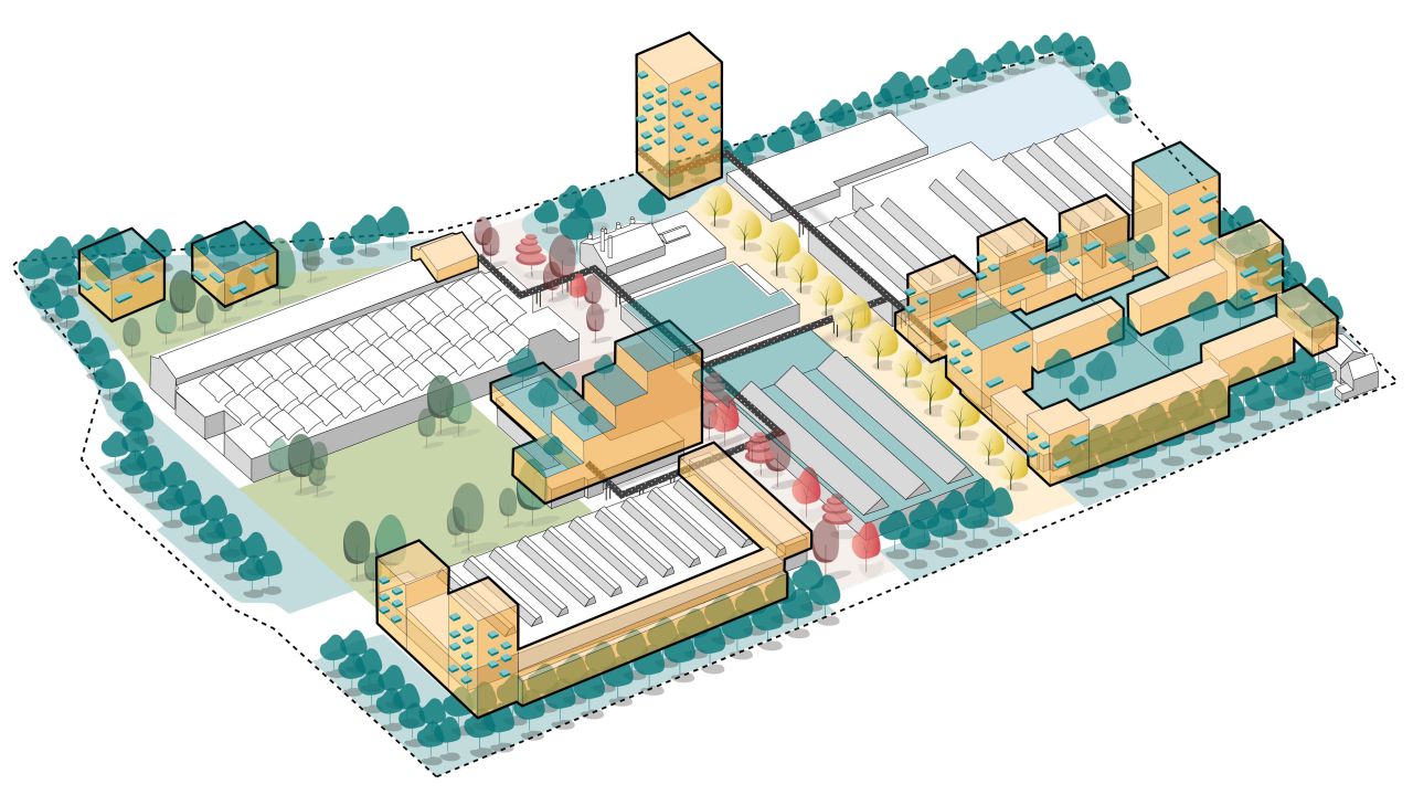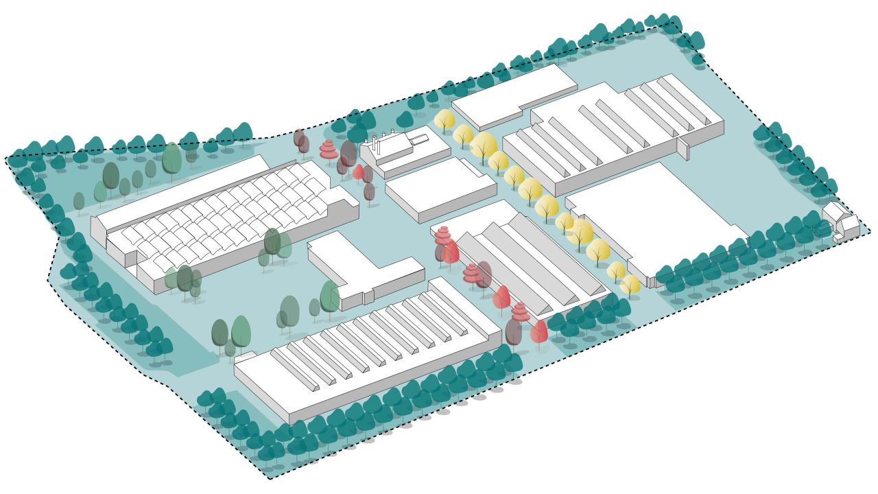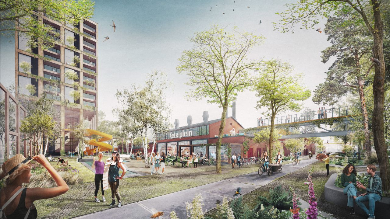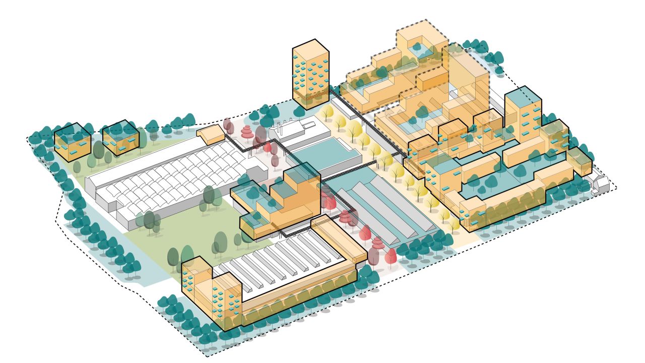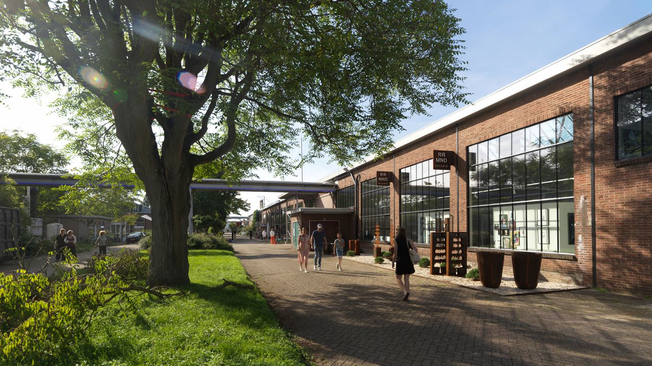No large-scale demolition, but a sustainable transformation. Seventy-five percent of the buildings will be converted into residences, studios, and workspaces for the creative industry," says Landscape Architect, Architect, and Urban Planner Hans Smolenaers. "It was important for us that the existing green and tree structures on the site would be preserved and enhanced by planting more trees." The design incorporates not only existing structures but also the reuse of materials already present, providing an efficient and sustainable solution. "The circularity of existing materials is evident in both the frameworks of various buildings and materials in the outdoor space," says project architect Luc Veeger. This includes the fire pond, the characteristic concrete shell elements of the shed roofs, the stelcon slabs, and even the structures of the pipe streets. This approach not only ensures efficient use of resources but also preserves the essence of this place.