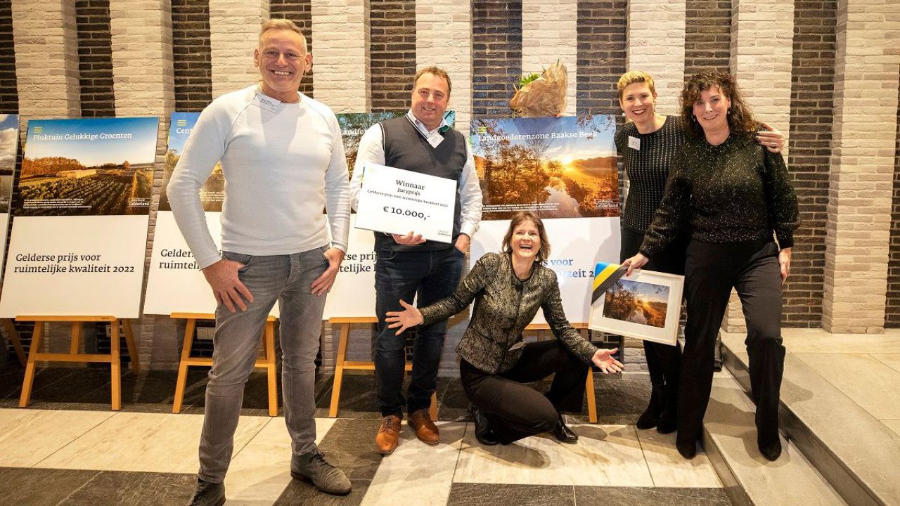 Landgoederezone Baakse Beek - Juryvoorzitter Walter Hamers (voorzitter Gelders Genootschap) maakte dinsdag 19 december 2022 de winnaar van de juryprijs bekend: Landgoederenzone Baakse Beek in gemeente Bronckhorst. Agrarisch landgebruik moet zich aanpassen aan bodem en water. Daarvoor werken landgoedeigenaren samen met onder meer Waterschap Rijn en IJssel en agrariërs. Ze zetten onder andere gebieden onder water om water op te slaan en planten klimaatbestendige begroeiing. Hamers: “Ze pakken niet alleen de droogte aan. Ze zorgen voor kwaliteit van het landschap langs de beek en 30 hectare mooie nieuwe natuur. Ze hebben aandacht voor het hele gebied én individuele kavels. Noodzaak en ruimtelijke kwaliteit gaan samen. Zo worden grote uitdagingen haalbaar. Ze hadden ook lef om de omgeving en organisaties te betrekken en te zorgen voor een cultuuromslag.” De winnaars zijn trots. “10, 15 jaar geleden stonden partijen tegenover elkaar. Ze wilden allemaal iets anders: natuur, landgoederen behouden, dat het gebied open bleef voor recreatie, landbouw. Wat ons allemaal raakte: klimaatverandering. We vonden dat we zelf verantwoordelijk waren. Water en bodem zijn leidend. Het waren vaak hele moeilijke keuzes, maar die samen maken helpt.”