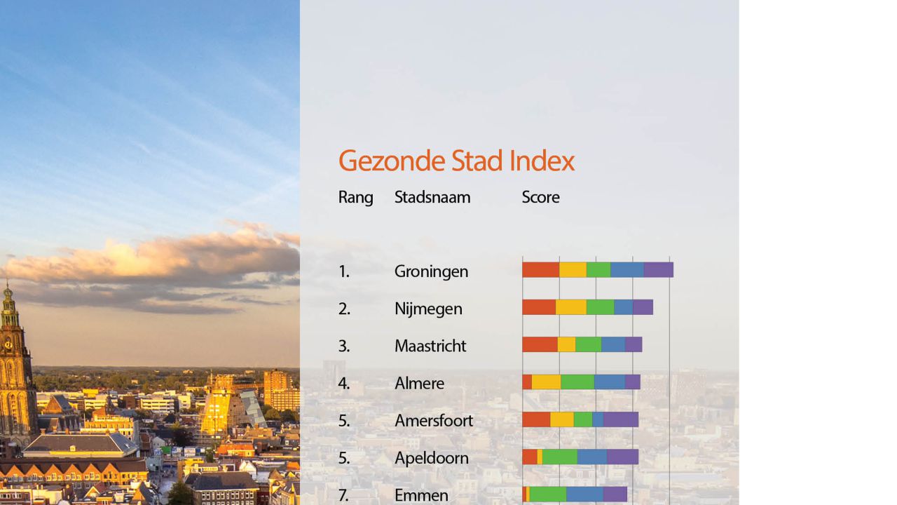 Groningen is de gezondste stad van Nederland blijkt uit dit onderzoek. Nummer twee is Nijmegen, Maastricht maakt de top drie compleet. We hebben de twintig steden (de grootste gemeente van elke provincie, aangevuld met de acht grootste gemeenten van Nederland) beoordeeld op vijf onderdelen: mobiliteit, buitenruimte, milieu, gebouwde omgeving en gemeenschap. Onze onderzoekers maakten daarbij gebruik van informatie van onder meer het RIVM, de GGD en het CBS.