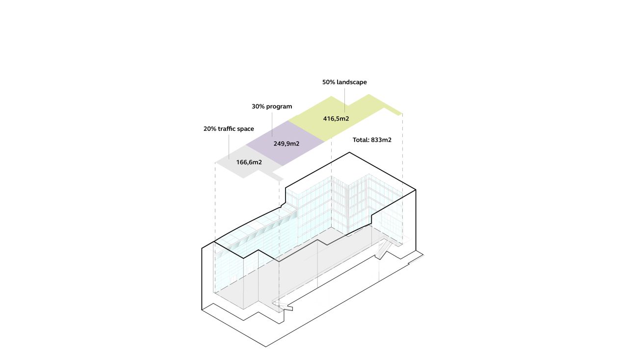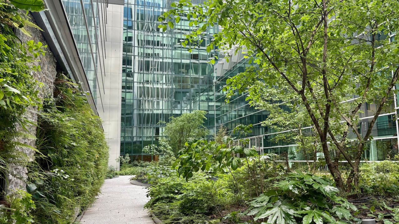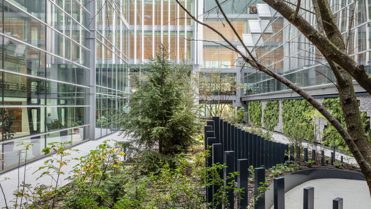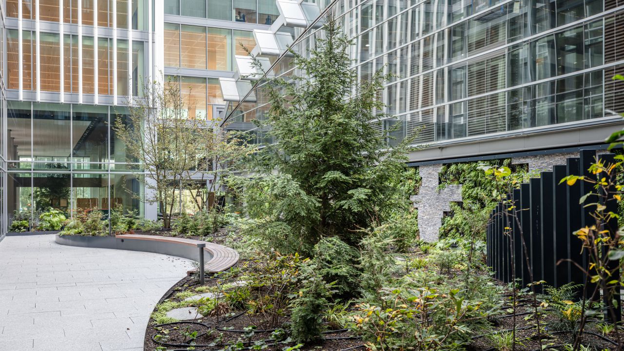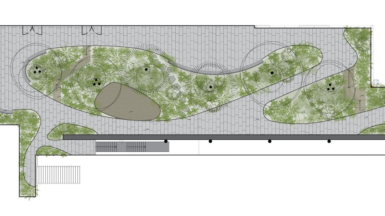 De ligging en opbouw van de patio kenden een aantal uitdagingen waar Arcadis Landschapsarchitectuur en Stedenbouw een oplossing voor heeft geboden. De patio ligt op verdieping 2 en is een daktuin. Het plaatsen van bomen diende te gebeuren bovenop een strakke rij kolommen van de onderliggende parkeergarage. Door te kiezen voor een variatie aan soorten en deze zo organisch mogelijk te positioneren, slaagden we erin een natuurlijk beeld te creëren.