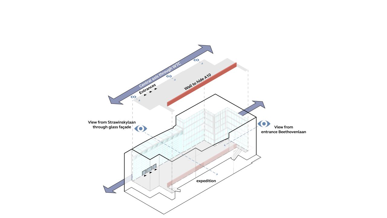 De logistieke bevoorrading van het WTC grenst direct aan de patio. De opening tussen dit hof en de patio zorgde voor een hoop geluidsoverlast en een onaangenaam windklimaat. We losten dit op door een groene wand te plaatsen: 41 meter lang en 2,5 meter hoog. De gebruikswaarde van de patio nam toe door een vermindering van windhinder en een afname van geluidsoverlast van de logistieke zone en nabijgelegen infra, zoals het spoor en de A10.